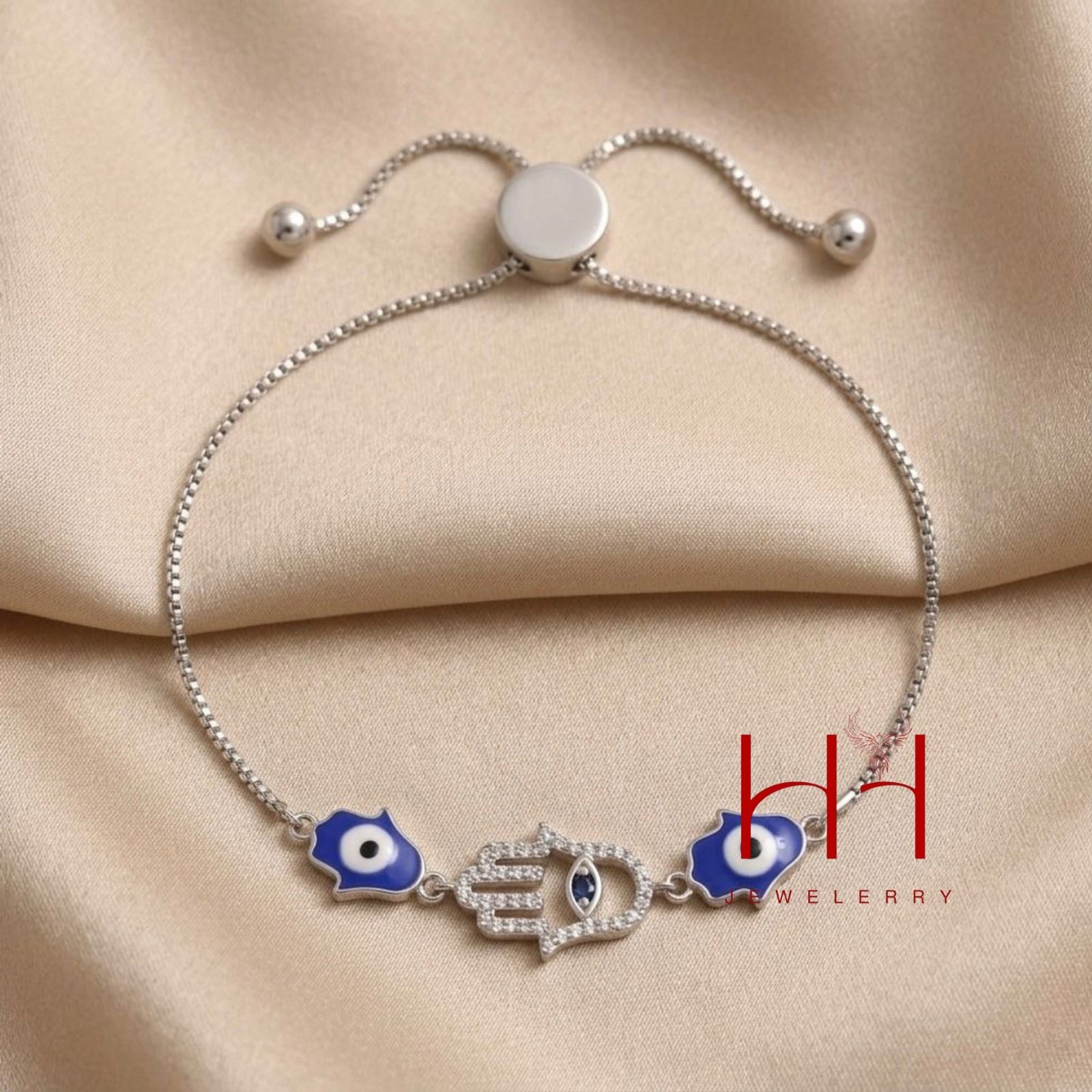 Klassik Göz Muncuğu simvolu və göy mina işləməli nəzər muncuqlarının modern vəhdəti. Mərkəzi fiqur üzərindəki sıx sirkon daşlar biləyinizdə zərif parıltı yaradır. Sürüşən bolero kilid sistemi sayəsində hər bilək ölçüsünə uyğun asanlıqla tənzimlənir.